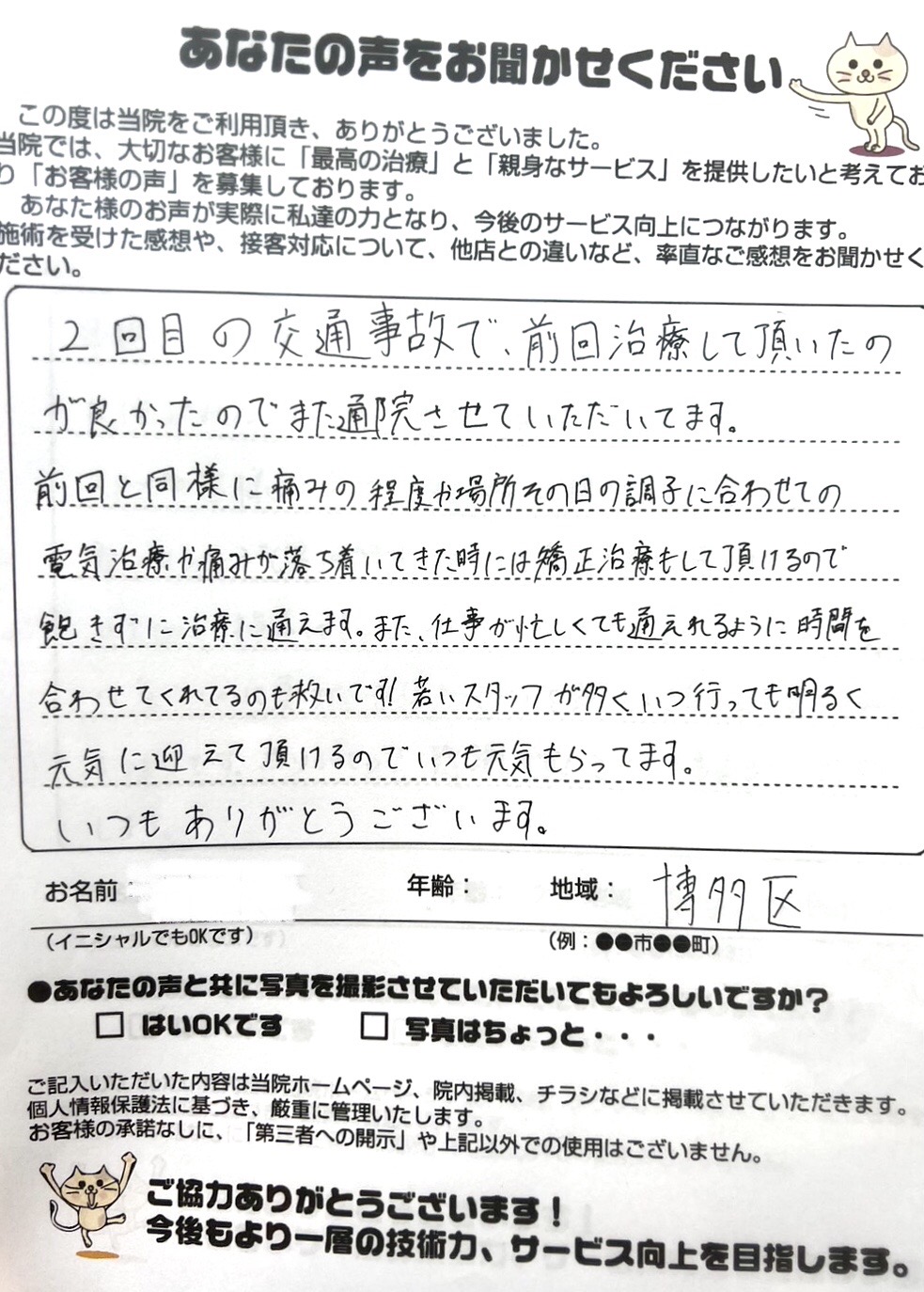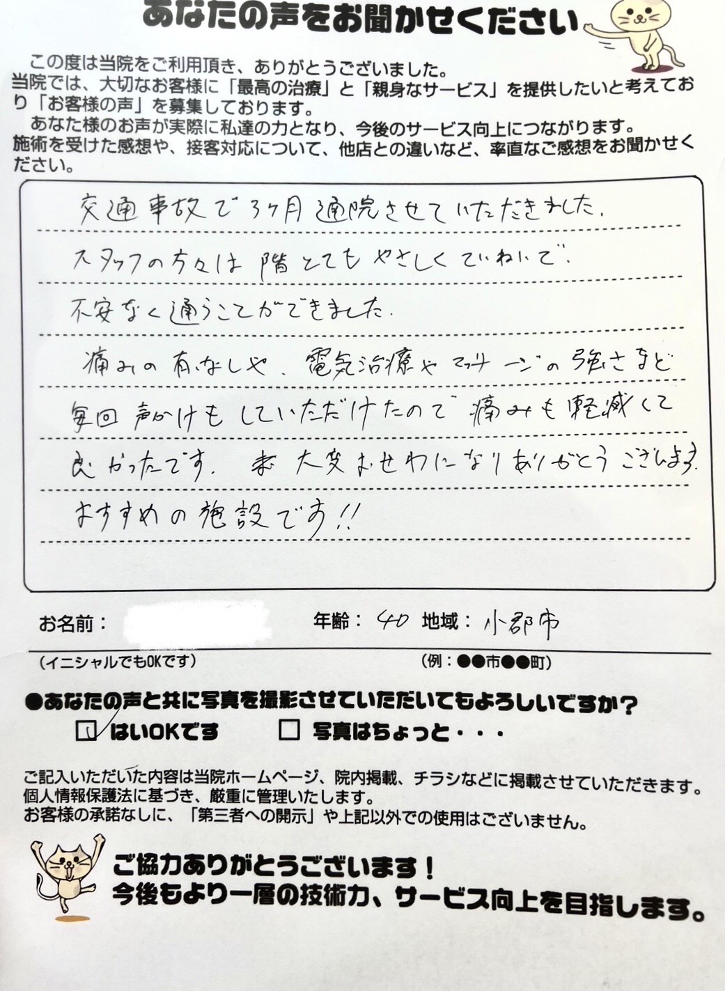 - 院には交通事故担当のスタッフがいますので治療のことだけでなく、手続きや補償についてわからないことはお聞きください。