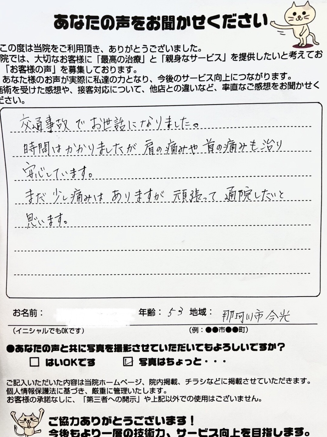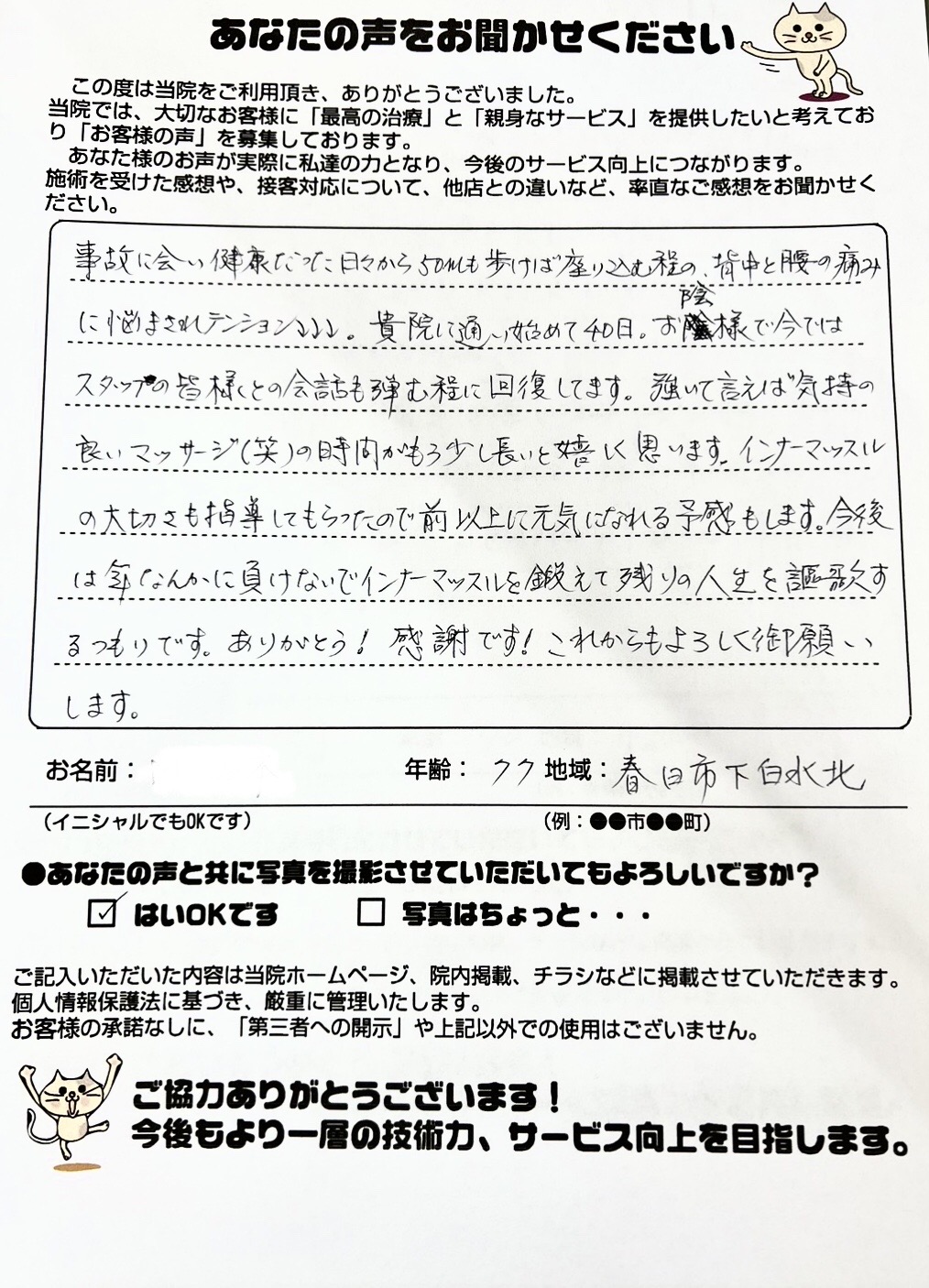 事故に遭われて、ダメージを受けた体は1回の施術だけで完全に治ってしまうことはありません。